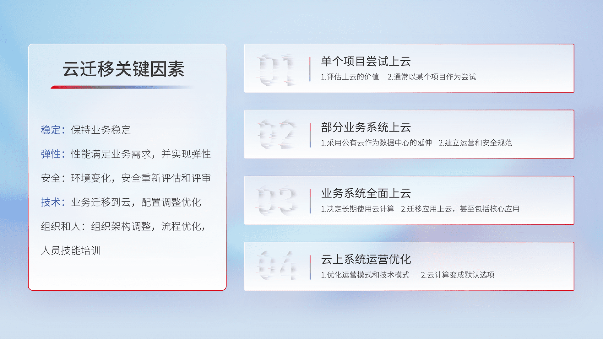 结合实际业务,,,从规划设计、、云平台选型、、、云原生改造、、、数据迁移、、、、集成交付,,迁移全过程为客户识别最佳上云路径,,,做好风险识别管理,,设计网络架构、、、、身份权限、、、安全审计合规、、、、操作审计、、日志审计、、、、监控告警策略、、、、多站点容灾设计等,,,,对云上基础设施进行整体规划,,,,提升IT治理水平,,,,以满足弹性、、、高可用、、高性能的需求。。