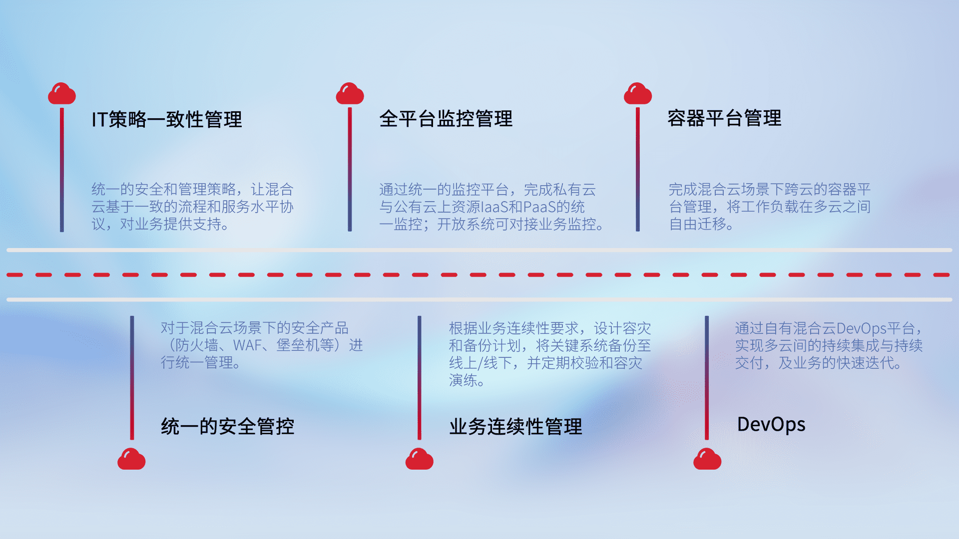通过多云纳管,,,,以统一的资源数据模型把客户的云资源进行抽象和封装,,,,进而实现对多云资源的统一操作,,保障云资源管理的可靠性、、、稳定性与可用性。。。量身定制化运维内容,,,,配置、、、、开发运维、、补丁管理、、、备份、、、、监控、、、、认证和访问管理、、、审计和日常巡检等,,,,保障在用云过程中的可靠度,,,,稳定度以及高可用率。。